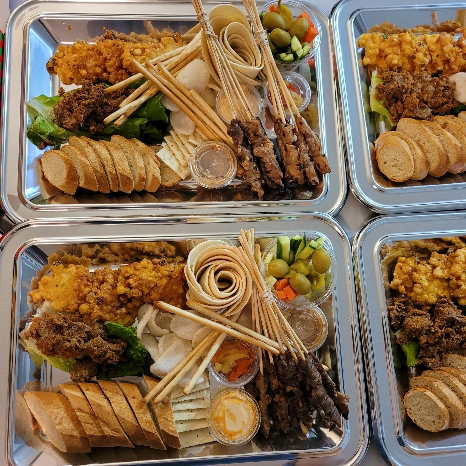 Beef rendang, Mixed satay, Artisan banquette, Taco shelf, Corn fritter, Olive, Crackers, Peanut sauce, Sambal aioli, Pickled vegetables and Kroepoek